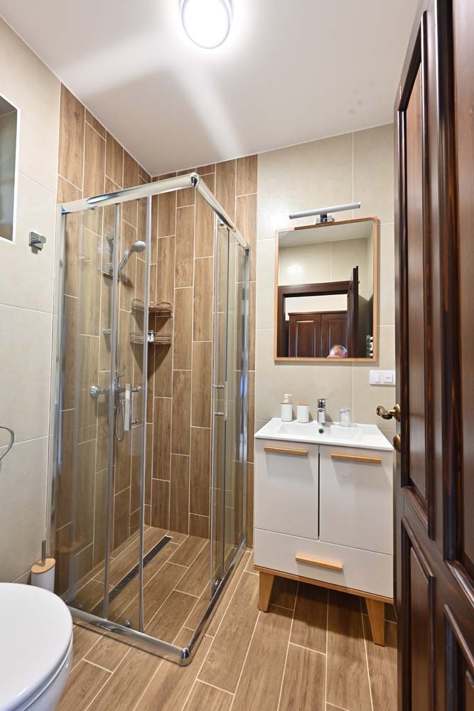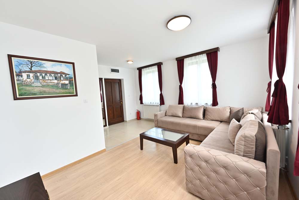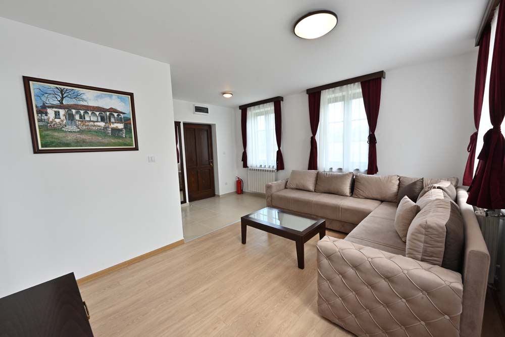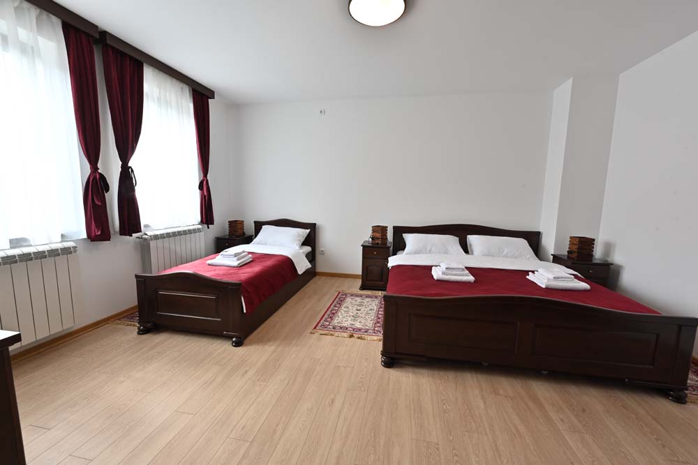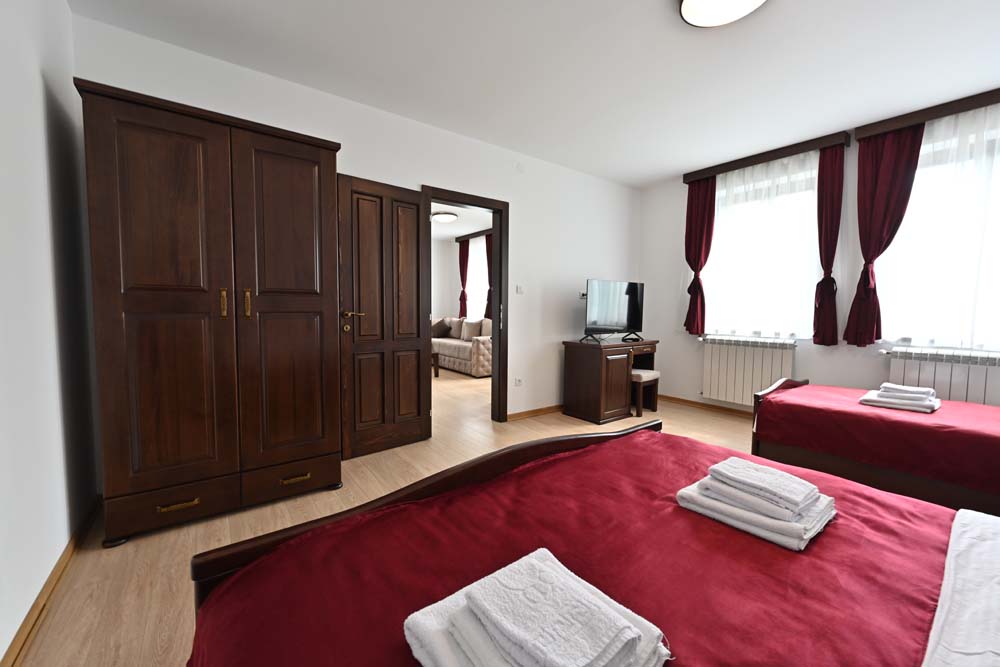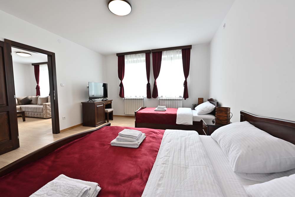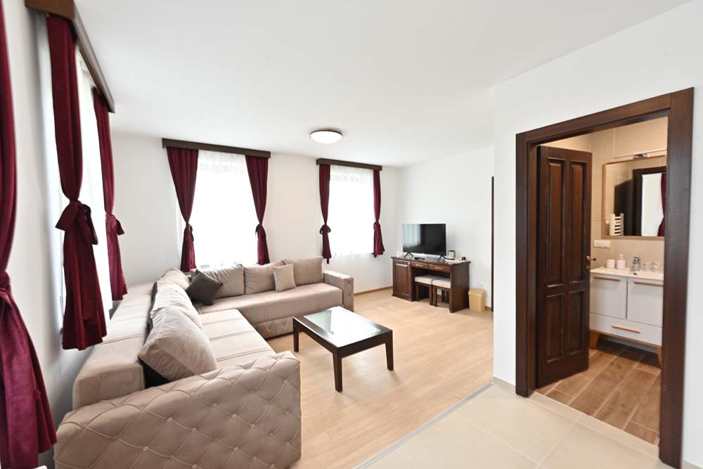 Prostrani apartman sa pogledom na planin Uživajte u udobnosti i prostranosti našeg apartmana od 45 m², savršenog za porodice ili grupe prijatelja. Apartman se nalazi na spratu i do njega se dolazi stepenicama, pružajući prelep pogled na planinu sa privatne terase.Spavaća soba je opremljena za maksimalnu udobnost: sadrži jedan ekstra veliki bračni krevet (dimenzija > 2 metra), jedan krevet za jednu osobu i udoban futon. U dnevnoj sobi se nalazi velika uglovna garnitura na razvlačenje, pružajući dodatni prostor za spavanje. Na zahtev je dostupan i besplatan krevetac za bebe.Apartman je zvučno izolovan, obezbeđujući mir i tišinu tokom celog boravka. Na raspolaganju vam je sopstveno kupatilo sa tušem, peškirima i hotelskom kozmetikom. Ostale pogodnosti uključuju besplatan bežični internet, flat-screen TV, frižider, grejanje, fen za kosu, garderober, vešalice i posteljinu.Ovaj apartman je idealan izbor za opuštajući odmor, kombinujući udobnost doma sa prelepim planinskim okruženjem.